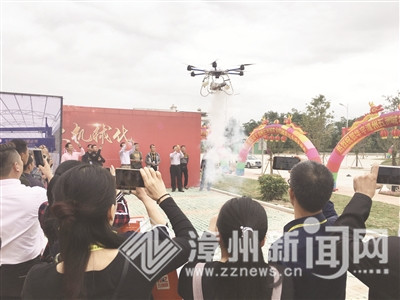 當(dāng)植保無人機(jī)在遙控器的指揮下騰空而起后,觀眾們紛紛拿起手機(jī)拍照、錄像。無人機(jī)平穩(wěn)飛行后,均勻噴灑出白色“農(nóng)藥”,隨著無人機(jī)在人叢上方環(huán)繞,一會(huì)兒功夫,人群就被白色煙霧所籠罩。