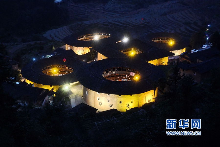 這是南靖縣梅林鎮(zhèn)坎下村的翠美樓夜景圖(11月22日攝)。新華社林善傳