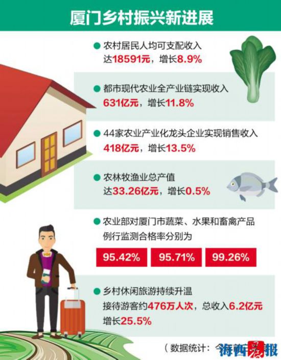 今年以來,廈門市農(nóng)業(yè)局以實(shí)施鄉(xiāng)村振興戰(zhàn)略為總抓手,扎實(shí)推進(jìn)全市“三農(nóng)”各項(xiàng)工作,牽頭推動(dòng)都市現(xiàn)代農(nóng)業(yè)千億產(chǎn)業(yè)鏈和鄉(xiāng)村振興千億投資工程。昨日上午,市農(nóng)業(yè)局就此召開新聞發(fā)布會(huì),對(duì)全市農(nóng)業(yè)農(nóng)村工作情況和“雙千億”工作情況進(jìn)行通報(bào)。從會(huì)上了解到,今年前三季度,全市農(nóng)村居民人均可支配收入較去年增長(zhǎng)8.9%,都市現(xiàn)代農(nóng)業(yè)全產(chǎn)業(yè)鏈?zhǔn)杖朐鲩L(zhǎng)11.8%。