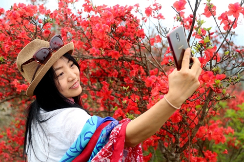 游客正拿出手機(jī)與嬌艷似火的杜鵑花合影 吳振偉/攝