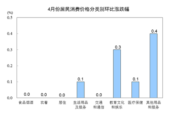 4月份,全國居民消費(fèi)價(jià)格環(huán)比上漲0.1%。其中,城市和農(nóng)村均上漲0.1%;食品價(jià)格下降0.1%,非食品價(jià)格上漲0.1%;消費(fèi)品價(jià)格與上月持平,服務(wù)價(jià)格上漲0.2%。