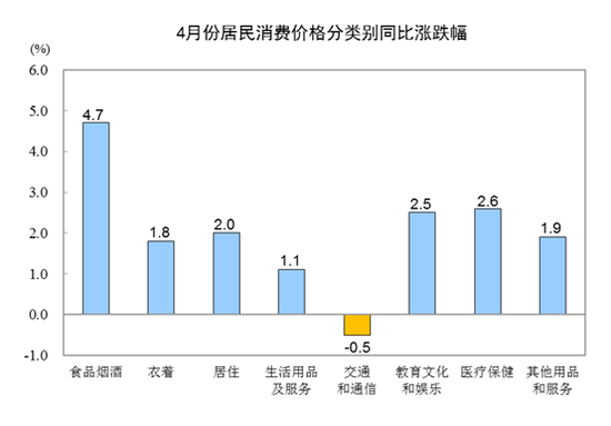 4月份,食品煙酒價(jià)格同比上漲4.7%,影響CPI(居民消費(fèi)價(jià)格指數(shù))上漲約1.40個(gè)百分點(diǎn)。其中,鮮菜價(jià)格上漲17.4%,影響CPI上漲約0.43個(gè)百分點(diǎn);鮮果價(jià)格上漲11.9%,影響CPI上漲約0.22個(gè)百分點(diǎn);畜肉類價(jià)格上漲10.1%,影響CPI上漲約0.42個(gè)百分點(diǎn)(豬肉價(jià)格上漲14.4%,影響CPI上漲約0.31個(gè)百分點(diǎn));禽肉類價(jià)格上漲5.0%,影響CPI上漲約0.06個(gè)百分點(diǎn);雞蛋價(jià)格上漲2.6%,影響CPI上漲約0.01個(gè)百分點(diǎn);糧食價(jià)格上漲0.4%,影響CPI上漲約0.01個(gè)百分點(diǎn);水產(chǎn)品價(jià)格下降1.4%,影響CPI下降約0.03個(gè)百分點(diǎn)。