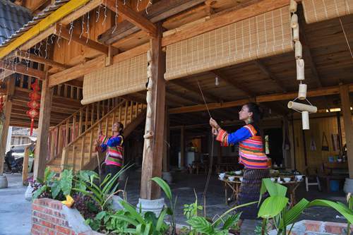 基諾族婦女姿梅是云南省景洪市基諾山基諾族鄉(xiāng)巴飄村村民。近年來,在國家扶貧政策的帶動下,她和家人積極從事鄉(xiāng)村民宿旅游,出售生態(tài)茶葉、野生蜂蜜和傳統(tǒng)民族織物等,經(jīng)濟條件明顯改善?;Z族是新中國成立后從原始社會末期直接過渡到社會主義社會的“直過民族”,1979年6月被國務(wù)院正式確認(rèn)為單一民族。圖為 姿梅(右)和弟媳拉開竹簾迎接客人。新華社 秦晴 攝