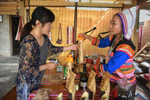 圖為 姿梅(右)在整理出售的傳統(tǒng)手工織物。 新華社 胡超 攝