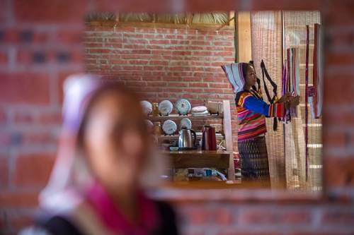 圖為 姿梅在整理出售的傳統(tǒng)手工織物。 新華社 秦晴 攝