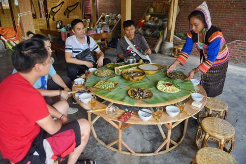 圖為 姿梅(右一)給客人端上基諾族美食。新華社秦晴攝