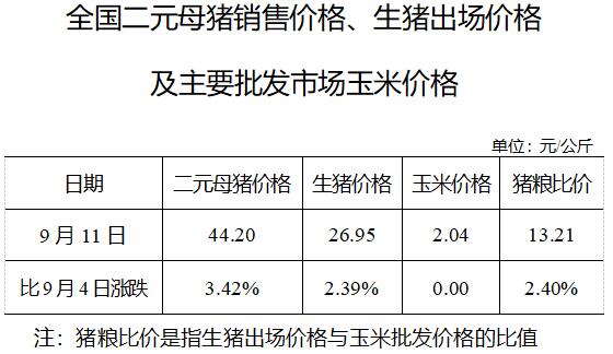 全國(guó)二元母豬銷售價(jià)格、生豬出場(chǎng)價(jià)格及主要批發(fā)市場(chǎng)玉米價(jià)格