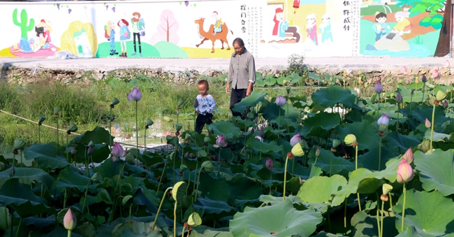 圖為壽寧縣鳳陽鎮(zhèn)官田村,村民施樹芳祖孫二人正在荷花池邊漫步。何家進(jìn)攝