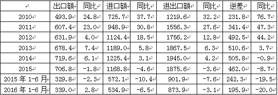 表12010-2016年中國農(nóng)產(chǎn)品進出口額