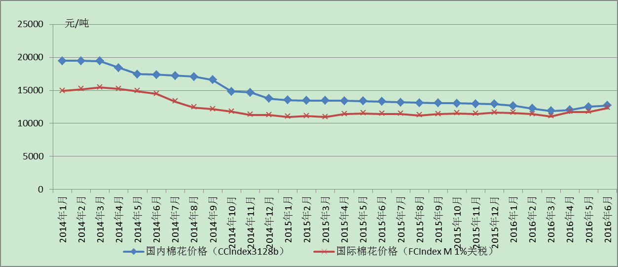 2014年棉花目標(biāo)價格改革后,國產(chǎn)棉價格更多由市場決定,國內(nèi)外價差進一步縮小。2016年6月進口棉配額內(nèi)稅后價與國產(chǎn)棉的價差收窄到357元/噸(圖2),企業(yè)進口動力減弱。在去庫存背景下,國家嚴格控制滑準(zhǔn)稅配額發(fā)放,也是棉花進口量下降的重要原因。