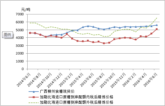 (四)食糖。近幾年在國內(nèi)外價差驅(qū)動下,食糖進口迅猛增加。2001-2009年進口100萬噸左右,2010年進口167.2萬噸,2011年以來進口量連續(xù)超過194.5萬噸的配額量,2015年創(chuàng)紀(jì)錄進口486.6萬噸,同比增加39.0%。今年上半年高位回落,共進口133.5萬噸,同比減少42.3%,占2015/16年度產(chǎn)量(按870萬噸計算)的15.3%,主要進口國為巴西(56.7%)、古巴(22.5%)和泰國(8.2%)。由于泰國、印度等幾大產(chǎn)糖國干旱減產(chǎn),國際食糖庫存連續(xù)5年增加后首次下降,國際糖價升高,配額內(nèi)進口利潤下降,今年5-6月配額外進口已無利潤(圖3),企業(yè)進口動力減弱,進口量下降。