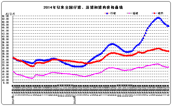 生豬價(jià)格。全國(guó)活豬平均價(jià)格18.69元/公斤,比前一周上漲0.8%,與去年同期相比(簡(jiǎn)稱同比,下同)上漲2.9%?;钬i價(jià)格上漲省份19個(gè),下降省份11個(gè)。西北地區(qū)活豬平均價(jià)格較高,為19.31元/公斤;東北地區(qū)較低,為17.87元/公斤。全國(guó)豬肉平均價(jià)格29.71元/公斤,與前一周持平,同比上漲6.4%。豬肉價(jià)格上漲省份14個(gè),持平省份2個(gè),下降省份14個(gè)。西南地區(qū)豬肉平均價(jià)格較高,為30.41元/公斤;華北地區(qū)較低,為28.87元/公斤。全國(guó)仔豬平均價(jià)格47.25元/公斤,比前一周下降0.3%,同比上漲38.5%。仔豬價(jià)格上漲省份10個(gè),持平省份2個(gè),下降省份18個(gè)。