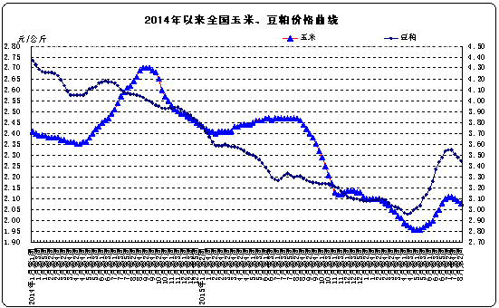 飼料價(jià)格。全國(guó)玉米平均價(jià)格2.08元/公斤,比前一周下降0.5%,同比下降15.8%。主產(chǎn)區(qū)東北三省玉米平均價(jià)格為1.91元/公斤,與前一周持平;主銷區(qū)廣東省玉米價(jià)格2.23元/公斤,比前一周下降1.8%。全國(guó)豆粕平均價(jià)格3.45元/公斤,比前一周下降0.9%,同比上漲4.2%。育肥豬配合飼料平均價(jià)格為3.1元/公斤,比前一周下降0.3%,同比下降4.6%。肉雞配合飼料平均價(jià)格為3.15元/公斤,與前一周持平,同比下降5.4%。蛋雞配合飼料平均價(jià)格為2.88元/公斤,與前一周持平,同比下降5.3%。