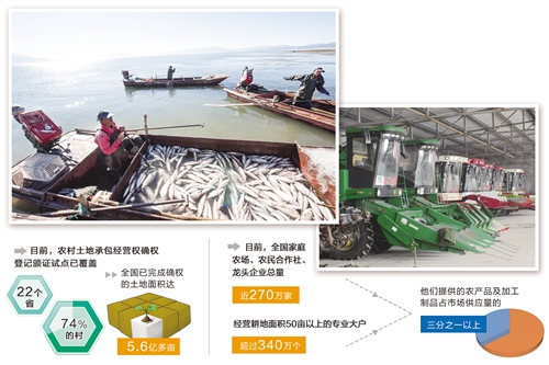 眼下,農(nóng)村土地承包經(jīng)營權(quán)確權(quán)登記頒證試點(diǎn)已覆蓋22個(gè)省份、74%的村,全國已完成確權(quán)的土地面積達(dá)5.6億多畝,土地流轉(zhuǎn)面積超過家庭承包經(jīng)營耕地總面積的三分之一,專業(yè)大戶、家庭農(nóng)場、農(nóng)民合作社、龍頭企業(yè)等新型經(jīng)營主體發(fā)展的土地基礎(chǔ)已經(jīng)很穩(wěn)固。目前,全國家庭農(nóng)場、農(nóng)民合作社、龍頭企業(yè)總量近270萬家,經(jīng)營耕地面積50畝以上的專業(yè)大戶超過340萬個(gè),他們提供的農(nóng)產(chǎn)品及加工制品占市場供應(yīng)量的三分之一以上。