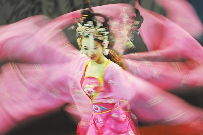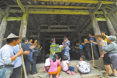 在古廊橋內(nèi),姑娘們精彩的表演贏得村民的掌聲。