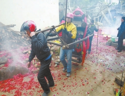 過(guò)去,每逢農(nóng)歷正月十四,新泉鄉(xiāng)家家都要備好1萬(wàn)至10萬(wàn)響鞭炮,用一塊門板作墊,將爆竹圈成三角形,像一面旗子,懸掛在屋前空坪上。正月十五凌晨1時(shí)許,村民用轎抬著“三太祖師”,舉著獅、豹、龍、鳳旗,敲鑼打鼓,自北村、西村至東南村游行一日(上圖)。所過(guò)之處猶如“巷戰(zhàn)”,各家各戶、各商鋪店面門口已擺好素品香果、上香燃燭,放起萬(wàn)響連子炮、禮炮煙花,震耳欲聾,遍地爆竹碎紙。