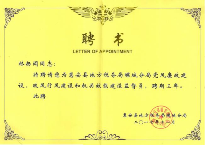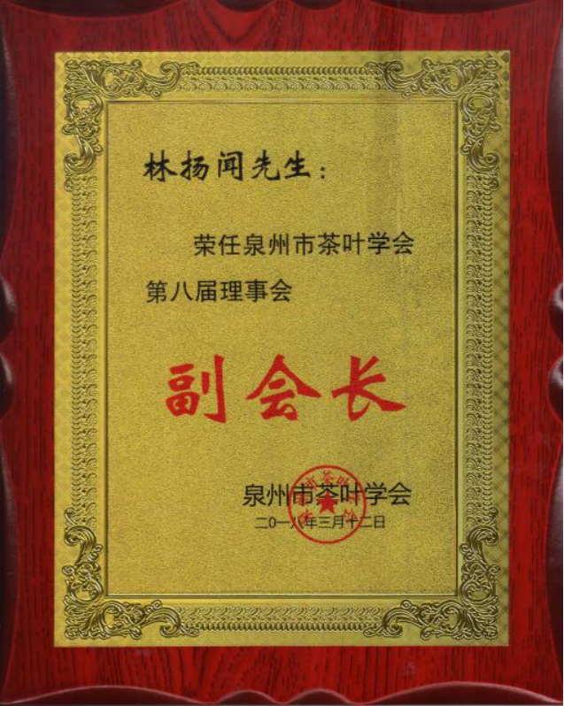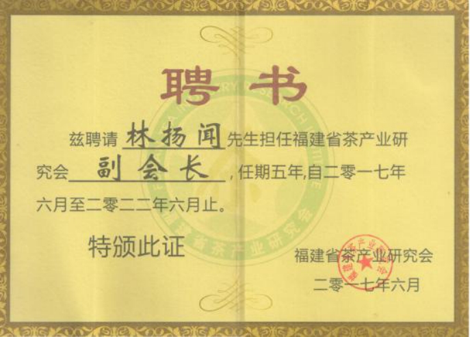 林揚(yáng)聞先生擔(dān)任多個(gè)職位:全國茶標(biāo)委烏龍茶工作組成員;非遺老字號中國馳名商標(biāo)裕園茶品牌創(chuàng)始人;福建省社科院屬下福建省茶產(chǎn)業(yè)研究會(huì)副會(huì)長;福建省烏龍茶初制清潔化標(biāo)準(zhǔn)小組成員;泉州市茶葉學(xué)會(huì)第八屆理事會(huì)副會(huì)長;國立華僑大學(xué)茶葉交流協(xié)會(huì)專業(yè)顧問;福建農(nóng)林大學(xué)茶學(xué)研究生課外輔導(dǎo)老師;福建農(nóng)林大學(xué)安溪茶學(xué)院本科生創(chuàng)業(yè)導(dǎo)師;黎明大學(xué)旅游學(xué)院專業(yè)群建設(shè)指導(dǎo)委員會(huì)委員等又有國家級評茶員高級工職業(yè)資格;制茶中級工程師職務(wù)任職資格等。