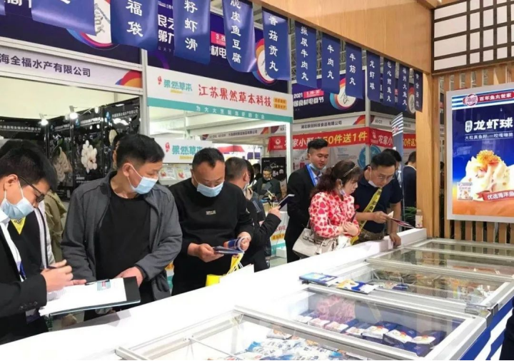 展會現(xiàn)場,火鍋燒烤食材占據(jù)半壁江山,其中海鮮丸類產(chǎn)品尤多。