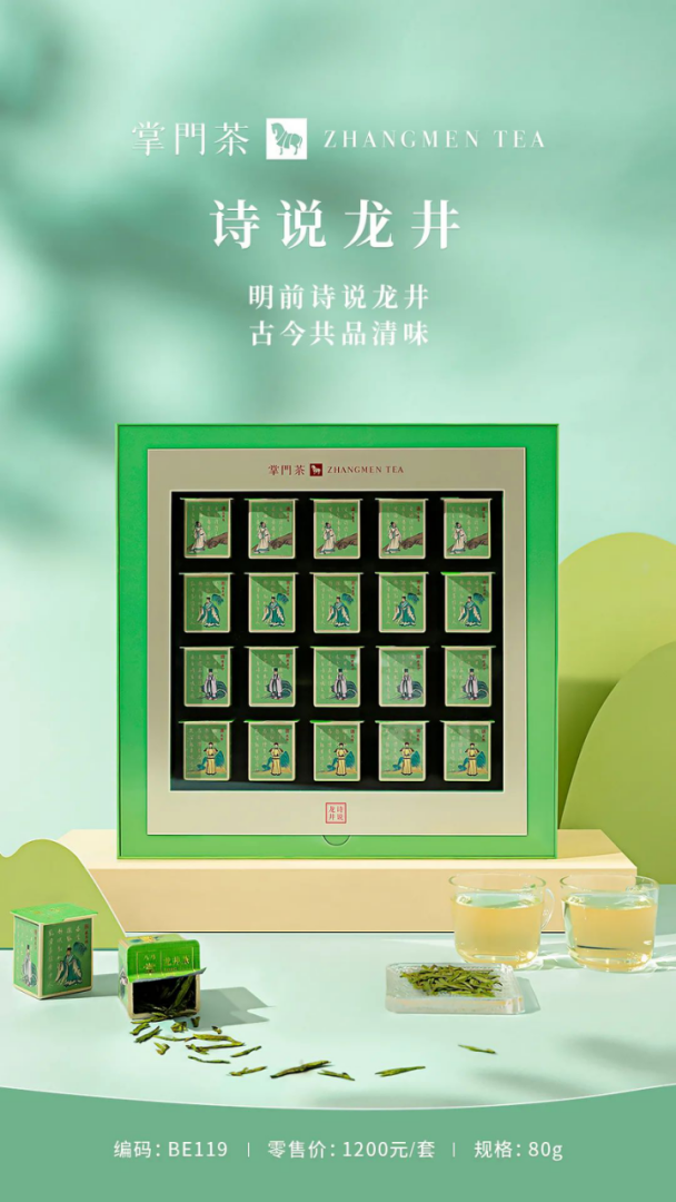 龍井茶自古便為文人墨客、名人圣賢所青睞。掌門茶·詩說龍井以唐宋明清四位詩人對龍井茶的吟誦為設(shè)計靈感,是精美雅致、內(nèi)涵豐富的藝術(shù)珍品。