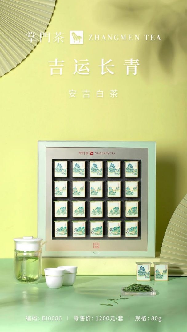 從源自安吉的重要綠色發(fā)展理念“綠水青山就是金山銀山”中汲取設(shè)計靈感,采用國畫綠水青山之景,致敬著名的《千里江山圖》,傳遞一份“好運常在,基業(yè)長青”的美好祝福。