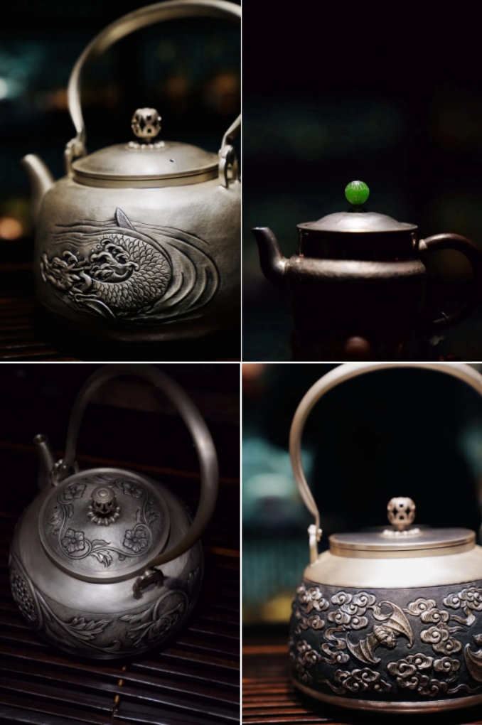 本次展銷會,共展出上千件古茶器,主要有銀壺、銅壺和鐵壺。滿墻古茶器,交相映襯,靜下心來端詳一番,會發(fā)現(xiàn)許多不一樣的美。