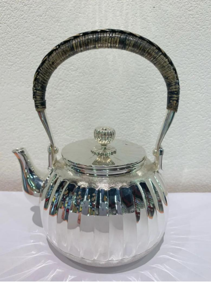 一款是銀壺—千葉立筋紋。立筋紋工法,表現(xiàn)出極高的延展力,以一片銀板不斷反復槌打延伸,紋路猶如玉帶緊貼在壁,全光鏡面處理,質感高潔,筋骨分明,剛柔并濟。