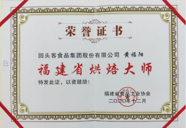 2020年福建省食品工業(yè)協(xié)會授予回頭客食品“烘焙大師”榮譽稱號,其品質(zhì)與口碑深受行業(yè)認(rèn)可。