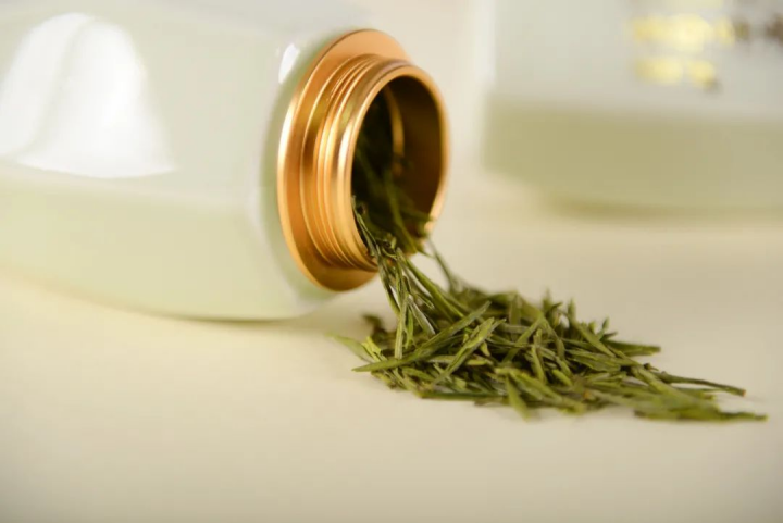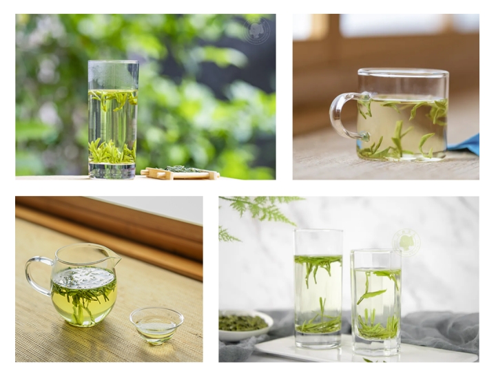 安吉白茶外形挺直略扁,形如蘭蕙,色澤翠潤如玉,形態(tài)細(xì)長,葉芽如金鑲碧鞘,內(nèi)裹銀箭,古人常用“鳳羽”來形容安吉白茶。沖泡時可見茶葉片片起舞,又如顆顆白玉悄悄臥底,姿態(tài)十分可人。