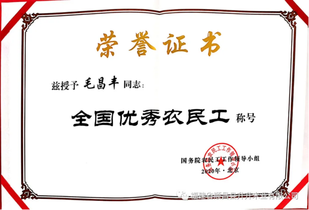 日前,在北京召開(kāi)的全國(guó)優(yōu)秀農(nóng)民工和農(nóng)民工工作先進(jìn)集體表彰大會(huì)上,福建省順昌縣升升木業(yè)有限公司員工毛昌豐榮獲“全國(guó)優(yōu)秀農(nóng)民工”稱號(hào)。