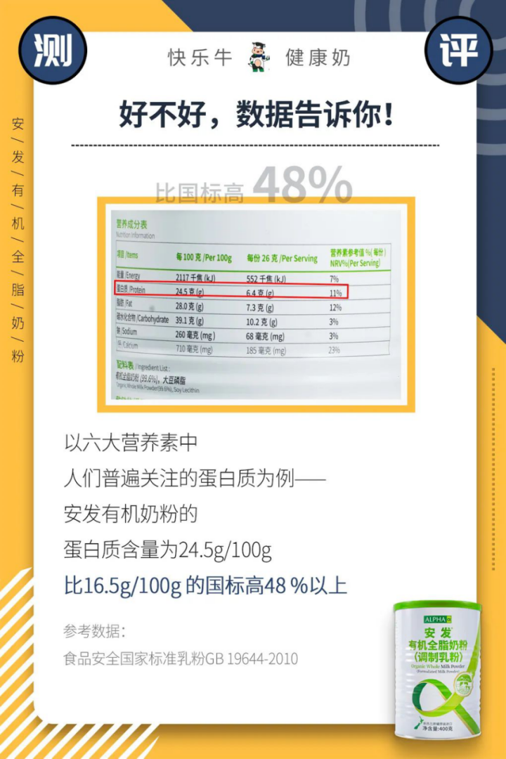 每100g安發(fā)有機(jī)奶粉、學(xué)生奶粉和中老年奶粉的優(yōu)質(zhì)蛋白質(zhì)含量分別為24.5g、23g、28.3g,均比16.5g/100g的國(guó)標(biāo)高39%以上。