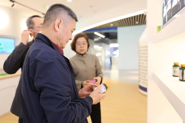 在安發(fā)科技文化館,高教授向靳曉明博士一行介紹他發(fā)現(xiàn)的“β”結(jié)構(gòu)的活性多糖D6