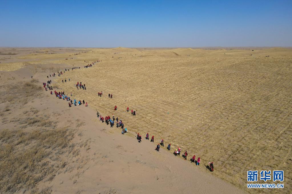 甘肅省民勤縣干部群眾前往沙漠腹地參加春季植樹治沙活動(2021年3月3日攝,無人機照片)。
