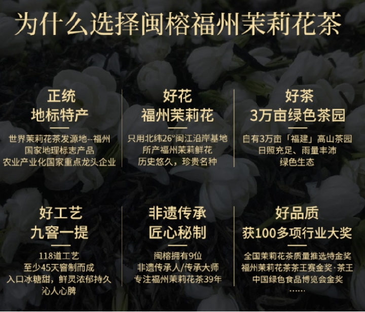 千米之上的高山綠茶與福州伏天茉莉鮮花完美邂逅,閩榕三十九年的福州茉莉花茶匠心品牌與九位工藝傳承大師的精心研發(fā),只為造就一款滿(mǎn)足普羅大眾都喝得起的日??诩Z茶。