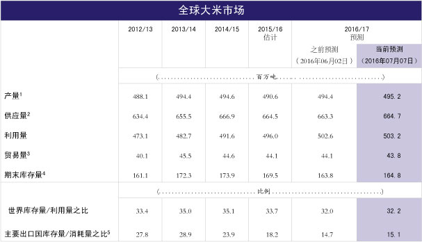 2016年全球粗糧產(chǎn)量預(yù)期下調(diào)820萬噸,降至13.164億噸。粗糧產(chǎn)量的下調(diào)主要?dú)w咎于巴西的前景惡化,干旱天氣損害了其第二季玉米作物的收成前景。中國預(yù)期的玉米產(chǎn)量也已下調(diào),原因是政府支持減少后,種植面積縮減。相反,2016年世界小麥產(chǎn)量現(xiàn)估計(jì)為7.32億噸,比6月的預(yù)期增加800萬噸,但仍然略低于2015年的紀(jì)錄。本月的上調(diào)依據(jù)是歐盟、俄羅斯聯(lián)邦(預(yù)期收成創(chuàng)紀(jì)錄)和美國等的收成前景因天氣良好而得到改善。中國和印度的收成預(yù)計(jì)也將增加,而土耳其的旱情削弱了其收成前景。2016年大米產(chǎn)量預(yù)報(bào)數(shù)比上月上調(diào)80萬噸,現(xiàn)估計(jì)世界大米產(chǎn)量將比2015年下降后的水平高出1.0%,達(dá)到4.952億噸。這些調(diào)整主要反映了亞洲尤其是老撾人民民主共和國和巴基斯坦的預(yù)期收成增加,完全抵消了主要是巴西預(yù)期收成的下降。