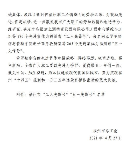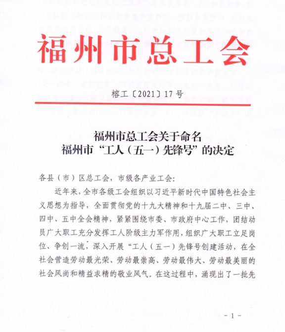 五一勞動節(jié)前,福州市總工會表彰了一批先進集體,我會理事單位福建仙芝樓生物科技有限公司品管部榮獲“五一先鋒號”榮譽稱號。