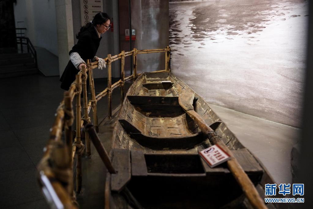 工作人員在遵義會議陳列館內(nèi)查看紅軍南渡烏江時使用的木船(1月26日攝)。新華社 歐東衢 攝