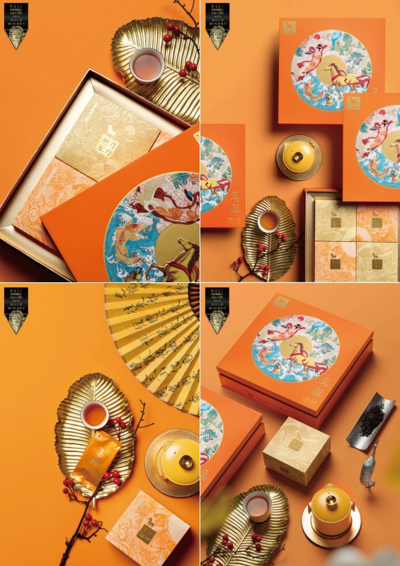 設(shè)計畫面以一輪圓月為中心,上有層巒聳翠,云霧繚繞,一杯茶自上奔騰而下,香氣四溢。左為飛騰的嫦娥,手托茶盤,宴請四方賓客。右為高頭大馬,身披錦帶,踏浪而來,象征馬到成功。錦鯉躍出海面,葫蘆從水面騰起,諧音寓意“福如東?!?。畫面構(gòu)圖飽滿,配色豐富而有序,氛圍喜慶而熱烈。