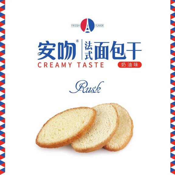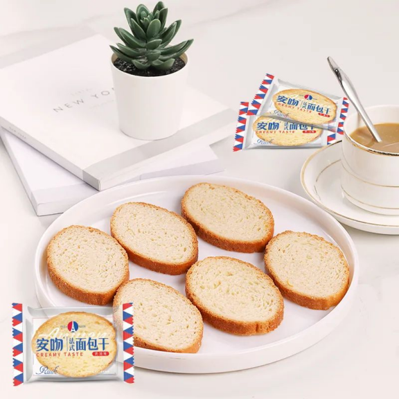 安吻法式面包干,更符合年輕人的消費喜好。產(chǎn)品運用多種工藝,保留了面包干原材料的獨特風(fēng)味。與柔滑奶油搭配,淡淡奶香,醇醇風(fēng)味。二次烘烤,外表呈橢圓型,蜂窩式的面包胚。輕咬一口,酥脆可口,清甜不膩,奶香十足。