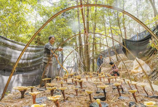 近日,福建霞浦縣溪南鎮(zhèn)南岸村霞洋自然村村民在村后山下的靈芝基地里,給靈芝澆水、除草。