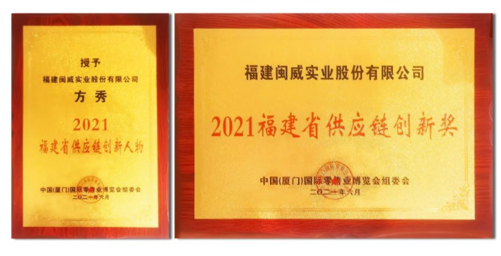 大會對在福建省供應(yīng)鏈創(chuàng)新發(fā)展中做出突出貢獻(xiàn)的企業(yè)及先進(jìn)人物進(jìn)行了表彰,我會理事單位福建閩威實業(yè)股份有限公司榮獲“2021福建省供應(yīng)鏈創(chuàng)新獎”,公司董事長方秀榮獲“2021福建省供應(yīng)鏈創(chuàng)新人物獎”。