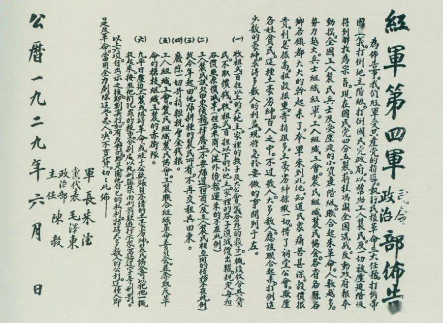 1929年6月,朱德、毛澤東、陳毅聯(lián)合署名的紅四軍司令部、政治部布告。