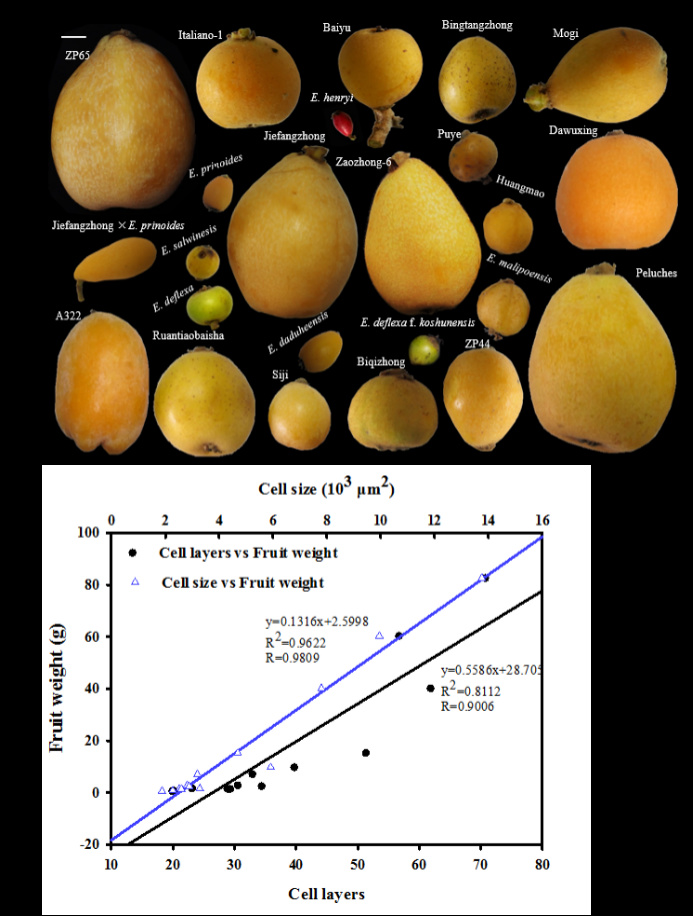 Figure.1Relationships among fruit weight and fruit cell characteristics in Eribotrya.