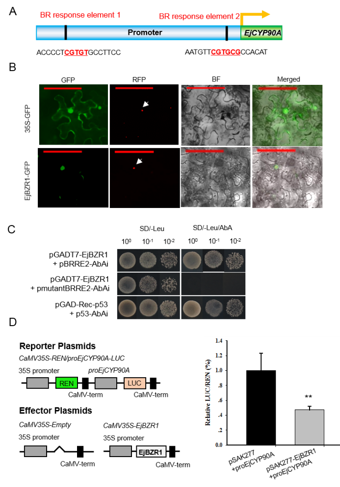 為證實EjBZR1是否通過EjCYP90A影響果實大小,團隊克隆了EjCYP90A啟動子,調(diào)控元件分析發(fā)現(xiàn)在EjCYP90A起始密碼子上游-178 bp ~-183 bp 和 -1717~-1722 bp 各有一個油菜素內(nèi)酯響應(yīng)元件(BRRE元件,CGTGT/CG)。雙熒光素酶報告試驗表明EjBZR1可抑制EjCYP90A表達,酵母單雜交進一步表明它可以結(jié)合到BRRE2元件上。
