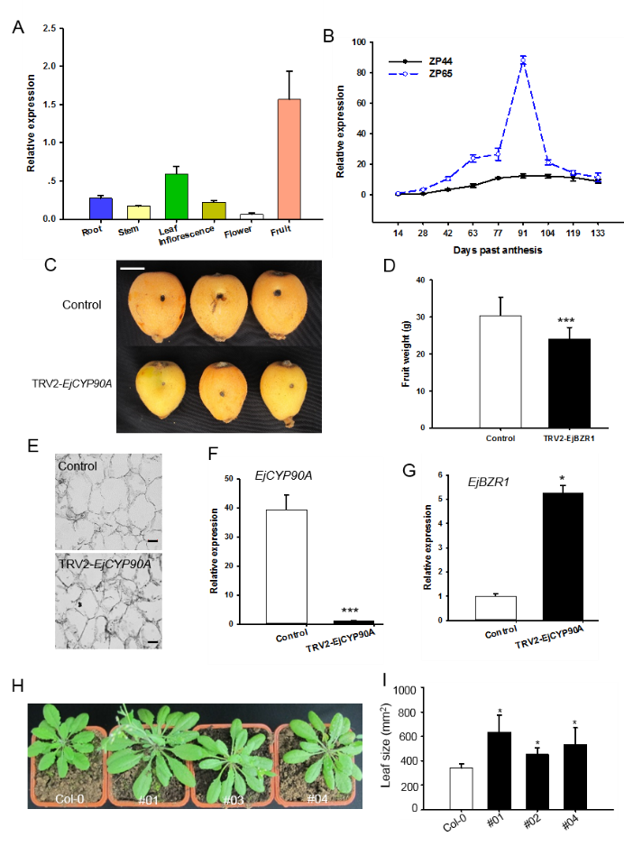 EjCYP90A是EjBZR1-VIGS處理中受影響最顯著的潛在下游基因,接下來團隊通過表達相關(guān)性分析發(fā)現(xiàn)它主要在果實膨大期上調(diào)表達,而且表達水平與細胞及果實大小正相關(guān)。VIGS處理抑制該基因表達后,果實的細胞及果實重量都明顯降低。在擬南芥中過表達該基因則促進植株葉片增大。這些結(jié)果表明,EjCYP90A是細胞膨大和果實增大的激活因子。
