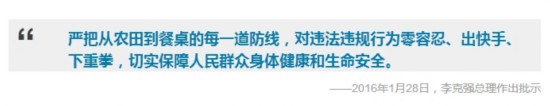 2016年1月28日,國(guó)務(wù)院總理李克強(qiáng)作出批示,他指出,保障食品安全仍面臨艱巨任務(wù),要毫不懈怠,持續(xù)攻堅(jiān)。各級(jí)政府要堅(jiān)持人民利益至上,切實(shí)發(fā)揮食安委統(tǒng)一領(lǐng)導(dǎo)、綜合協(xié)調(diào)作用,以改革精神和法治思維,堅(jiān)定實(shí)施食品安全戰(zhàn)略,加快健全從中央到地方直至基層的權(quán)威監(jiān)管體系,落實(shí)最嚴(yán)格的全程監(jiān)管制度,嚴(yán)把從農(nóng)田到餐桌的每一道防線(xiàn),對(duì)違法違規(guī)行為零容忍、出快手、下重拳,切實(shí)保障人民群眾身體健康和生命安全。