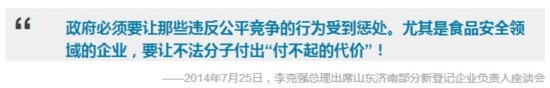 2014年7月25日,國(guó)務(wù)院總理李克強(qiáng)在山東濟(jì)南召開(kāi)部分新登記企業(yè)負(fù)責(zé)人座談會(huì)。在會(huì)上,李克強(qiáng)說(shuō),政府要嚴(yán)格監(jiān)管,創(chuàng)造公平競(jìng)爭(zhēng)的環(huán)境,讓企業(yè)在競(jìng)爭(zhēng)中公平、健康發(fā)展。“如果誰(shuí)違反規(guī)則卻沒(méi)有受到應(yīng)有的懲罰,這就打擊了那些誠(chéng)信守法、注重質(zhì)量、講求效益的企業(yè),就會(huì)造成‘劣幣驅(qū)逐良幣’。因此,政府必須要讓那些違反公平競(jìng)爭(zhēng)的行為受到懲處。尤其是食品安全領(lǐng)域的企業(yè),要讓不法分子付出‘付不起的代價(jià)’!”李克強(qiáng)斬釘截鐵說(shuō)道