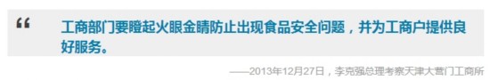 2013年12月27日下午在天津大營(yíng)門(mén)工商所,李克強(qiáng)總理詳細(xì)詢(xún)問(wèn)轄區(qū)食品生產(chǎn)經(jīng)營(yíng)商戶(hù)的監(jiān)管方式和質(zhì)檢手段。他提醒工作人員,食品關(guān)系群眾健康和生命,要絕對(duì)保證安全。大部分消費(fèi)者直接從市場(chǎng)購(gòu)買(mǎi)食品,工商部門(mén)要瞪起火眼金睛防止出現(xiàn)食品安全問(wèn)題,并為工商戶(hù)提供良好服務(wù)