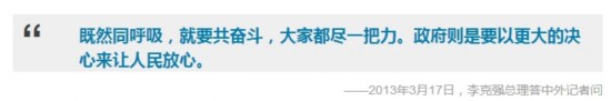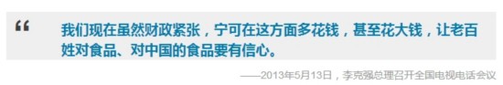 2013年3月17日,李克強(qiáng)總理在人民大會(huì)堂會(huì)見(jiàn)中外,并回答提問(wèn)。有問(wèn),中國(guó)食品安全問(wèn)題日益嚴(yán)重,中國(guó)政府將如何解決?總理說(shuō),食品安全,那可以說(shuō)是天大的事,直接關(guān)系到人們的生活質(zhì)量和身體健康。政府應(yīng)該對(duì)假冒偽劣和黑心食品堅(jiān)決進(jìn)行查處,并且讓不法分子付出昂貴的代價(jià)??偫磉€表示,不論是污染狀況、食品問(wèn)題,還是治理和處置的效果,都要公開(kāi)透明,讓公眾、媒體能夠充分有效地加以監(jiān)督,“這也是形成一種倒逼機(jī)制,來(lái)硬化企業(yè)和政府的責(zé)任,也可以增強(qiáng)人們自身的防護(hù)意識(shí)”。他號(hào)召,“既然同呼吸,就要共奮斗,大家都盡一把力。政府則是要以更大的決心來(lái)讓人民放心。”