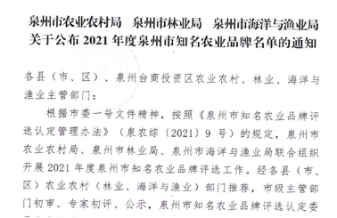 近日,根據(jù)《泉州市知名農(nóng)業(yè)品牌評選認定管理辦法》(泉農(nóng)綜〔2021〕9號)的規(guī)定,泉州市農(nóng)業(yè)農(nóng)村局、泉州市林業(yè)局、泉州市海洋與漁業(yè)局公布了2021年度泉州市知名農(nóng)產(chǎn)品品牌推薦名單,我會理事單位福建省泉州市裕園茶業(yè)有限公司的鐵觀音在眾多茶葉品牌中脫穎而出,成功獲評“2021年度泉州市知名農(nóng)產(chǎn)品品牌”稱號。