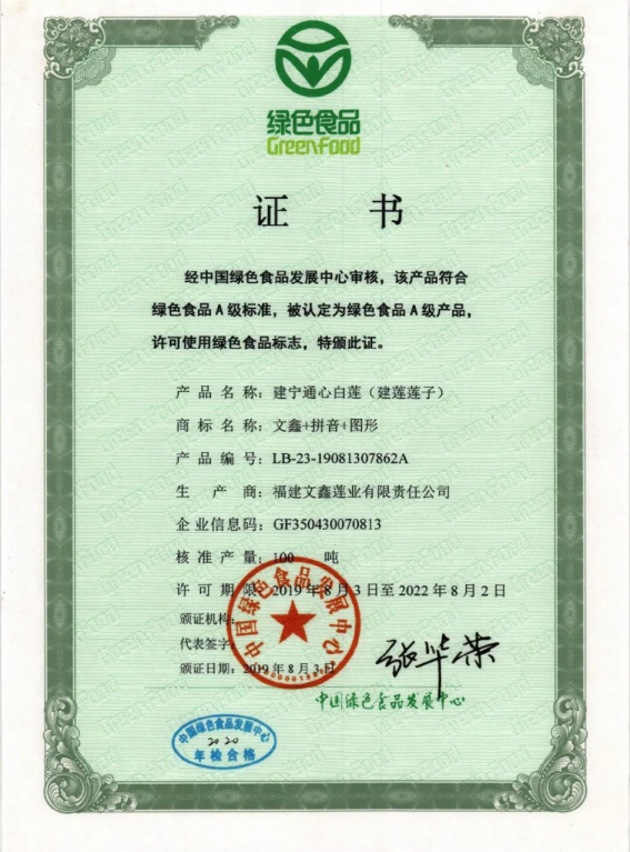 文鑫公司現(xiàn)建有1000畝有機(jī)建蓮基地、1000畝道地藥材生產(chǎn)基地和3000畝綠色建蓮基地,受權(quán)使用建寧通心白蓮農(nóng)產(chǎn)品地理標(biāo)志。連續(xù)17年認(rèn)證、續(xù)展綠色食品,保持有機(jī)食品再認(rèn)證12年,榮獲“全國(guó)百家綠色食品示范企業(yè)”稱號(hào)。